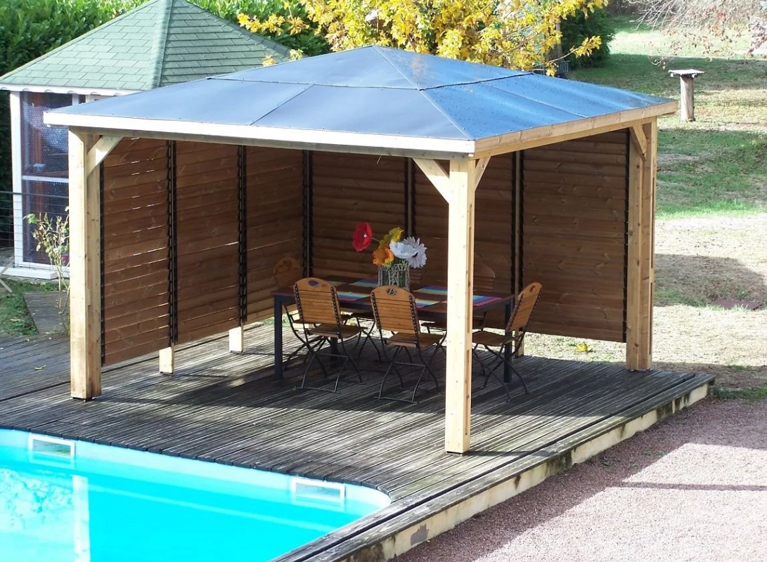 Cet abri de piscine donnera un véritable coup de cachet à votre extérieur et vous permettra de profiter de vos espaces extérieurs. Abri en bord de piscine ou salon extérieur couvert : cet abri de jardin en bois massif de 14,36 m² est adaptable en fonction de votre jardin et surtout de vos envies. Cet abri de jardin couvert avec deux parois à ventelles vous permettra de profiter de votre jardin sous toute météo. Sapin massif traité sous très haute température, cet abri de jardin s’inscrira dans le temps et nécessitera que peu d’entretien.